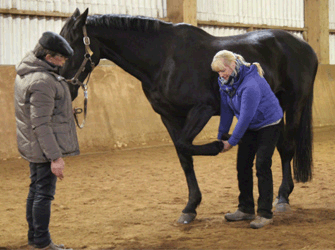 Nachdem vor allem auch die Problematik von Engständen der Wirbelkörper und Dornfortsätze erläutert wurde zum Beispiel das Quetschen von Nerven, gingen wir gut gestärkt von leckeren Suppen, Kaffee und Kuchen in die Halle, um nun in die Praxis des Dehnen und Massierens eingeführt zu werden. Hier durften wir in Zweier-Grüppchen an die Pferde. Mit Kreide wurde aufs Pferd gemalt - da wo Problemstellen vermutet wurden. So begannen wir unter der Anleitung von Mechthild Bading , mit streichenden und klopfenden Bewegungen die Durchblutung der Muskulatur der Tiere anzuregen, dann endlich zu dehnen und massieren. Die Pferde ließen uns sehr deutlich spüren was ihnen gut tat und wobei sie entspannen konnten. Sie zeigten uns aber auch schnell, wo sie eventuell Verspannungen haben könnten.