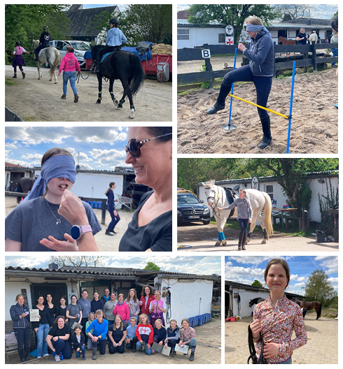 Nach einer Stunde Theorie wurde das neue Wissen in die Praxis umgesetzt. Für jede Gruppe standen 3 Pferde zur Verfügung. Nun konnten unsere Lehrgangsteilnehmer überprüfen und üben, wie gut die Kommunikation zwischen ihnen und den Pferden funktioniert.