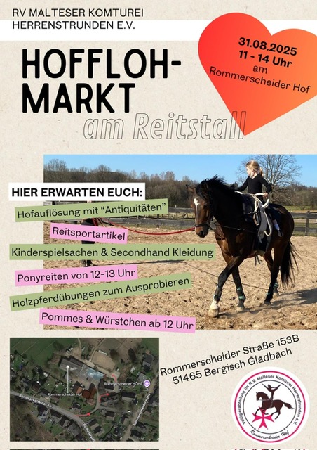Am 31.8. 2025 ab 11.00 Uhr veranstalten wir einen Flohmarkt mit allem, was wir abgeben müssen, vom Stallequipement bis hin zu Turniertrikotsätzen, Trainingskleidung (neu), Pferdeausrüstung Reiten/Voltigieren und mehr. Fragen hierzu gerne unter rv-mkh@arcor.de